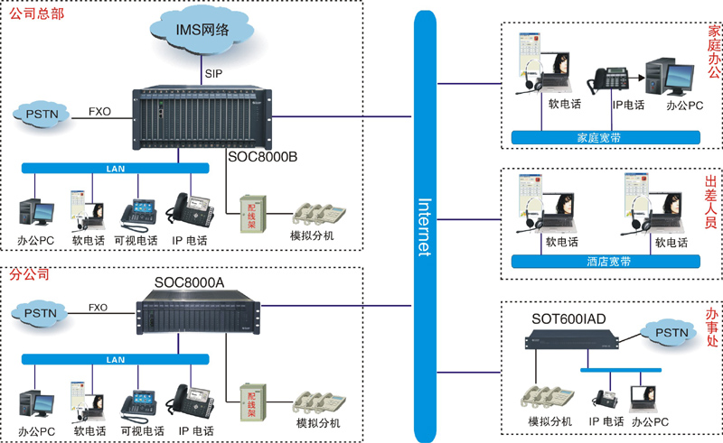 Ø 公司總部:在總部機房部署一臺SOC8000IPPBX,單機最大容量為1536線,通過SIP協議注冊到移動IMS平臺;同時提供E1/FXO接口與企業原電信運營商連接;通過以太網口接入Internet局域網;